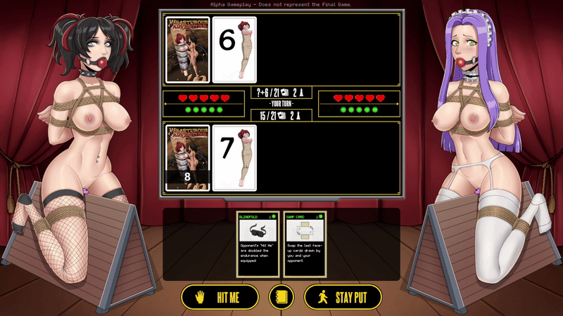 "Tie Me, Bind Me, Hit Me!" is a kinky take on the classic card game of Blackjack, or 21. Go head-to-head against opponents and try to get as close to 21 as you can without going bust, but watch out - In this version of Blackjack, 'Hit me' really does mean Hit me! Each time you draw a card you get hit, and whoever loses gets punished!